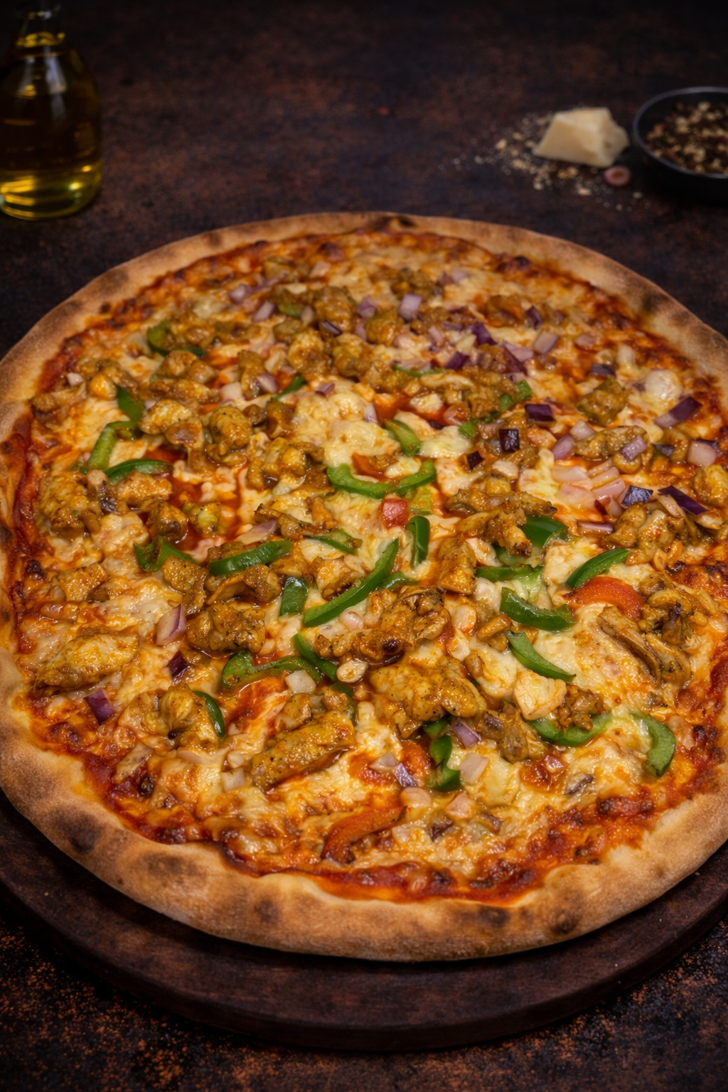 En fargerik og smakfull pizza som skinner med sin enkle sjarm! Den hviler på en livlig tomatsaus og et tykt lag smeltet mozzarella som smelter inn i hver bit. Marinert kylling tilfører en saftig og lett krydret rikdom, mens søt mais gir små, sprø smaksbomber. Frisk løk bidrar med en aromatisk crunch, og paprika spruter inn med sin sødmefulle, fargerike karakter. Dette er en pizza som føles lett og balansert, men likevel full av liv – en herlig trio av smaker som lyser opp tallerkenen!