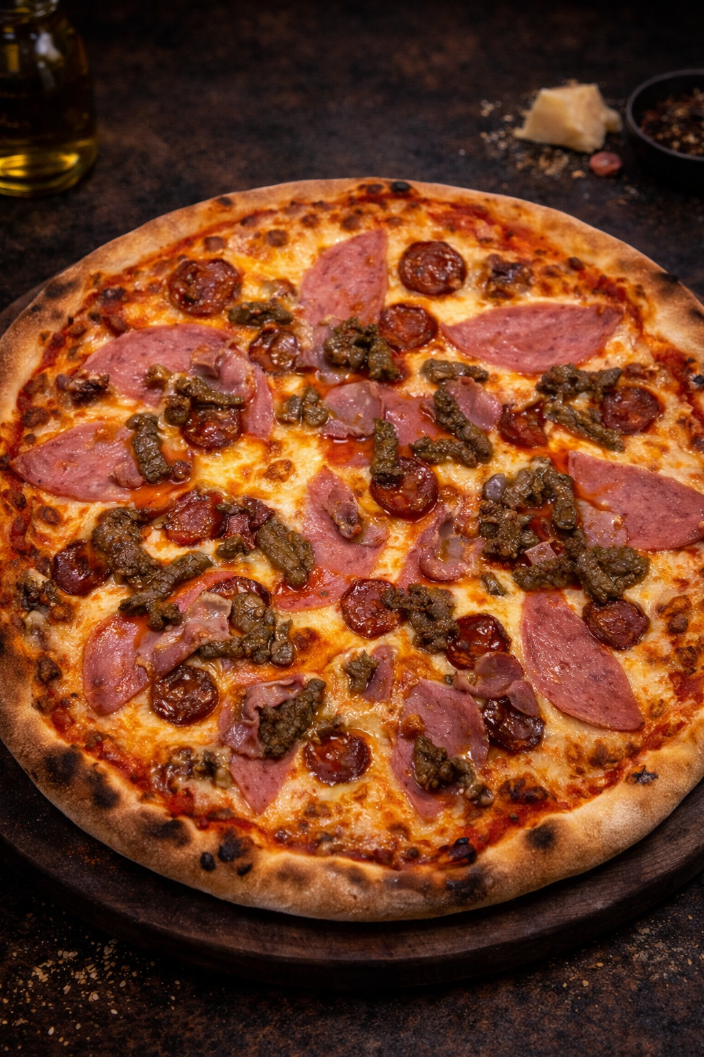 En overdådig og kjøttfull pizza som er en sann nytelse for carnivorer! Den starter med en rik tomatsaus og et generøst lag smeltet mozzarella som binder sammen alle de kraftige smakene. Saftig skinke gir en mild og salt grunnstone, mens marinert biffkjøtt tilfører en dyp, saftig intensitet. Krydret pepperoni setter fyr på ganen med sitt spicy kick, og sprøtt bacon avrunder med en røkt, robust rikdom. Dette er en pizza som oser av maskulin sjarm og smak – perfekt for de som vil ha alt på én gang!